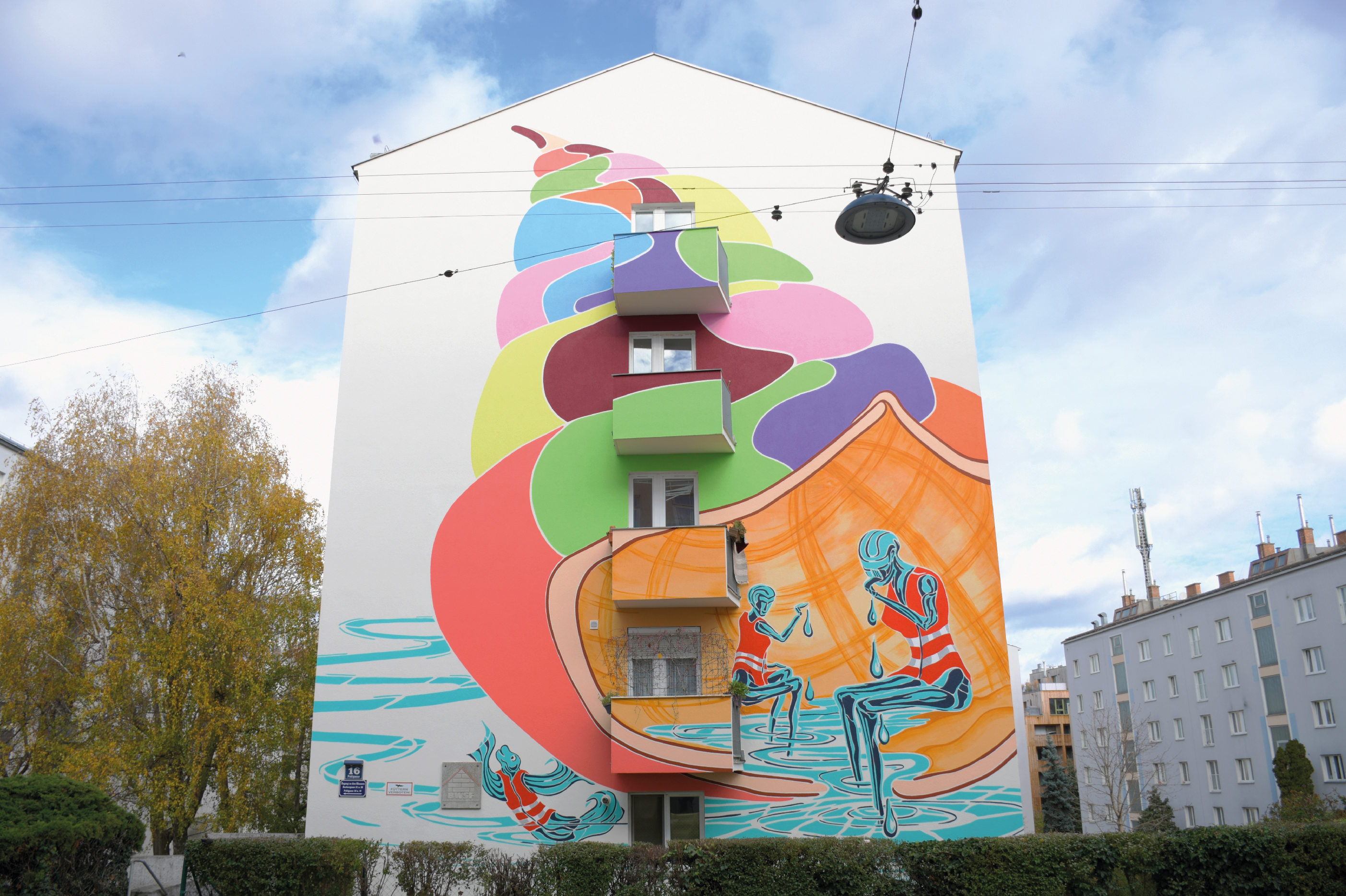 Insgesamt acht Wohnbauten stellt der ÖSW Konzern renommierten Künstler:innen zur Gestaltung zur Verfügung. Die neue Fassadenkunst wird dabei mehr als visuelle Bereicherung verstanden: Sie steht für eine künstlerische Auseinandersetzung mit gesellschaftspolitischen Themen und soll einen wertvollen Beitrag zur lebendigen Kultur und Identität des jeweiligen Stadtteils leisten. Mit der erfolgreichen Fertigstellung des ersten Kunstwerks in der Pohlgasse in 1120 Wien wurde vor kurzem ein bedeutender Meilenstein erreicht. Die positive Resonanz der Bewohner:innen und die spürbare Aufwertung des Wohnviertels bestätigen den Erfolg des Projekts.