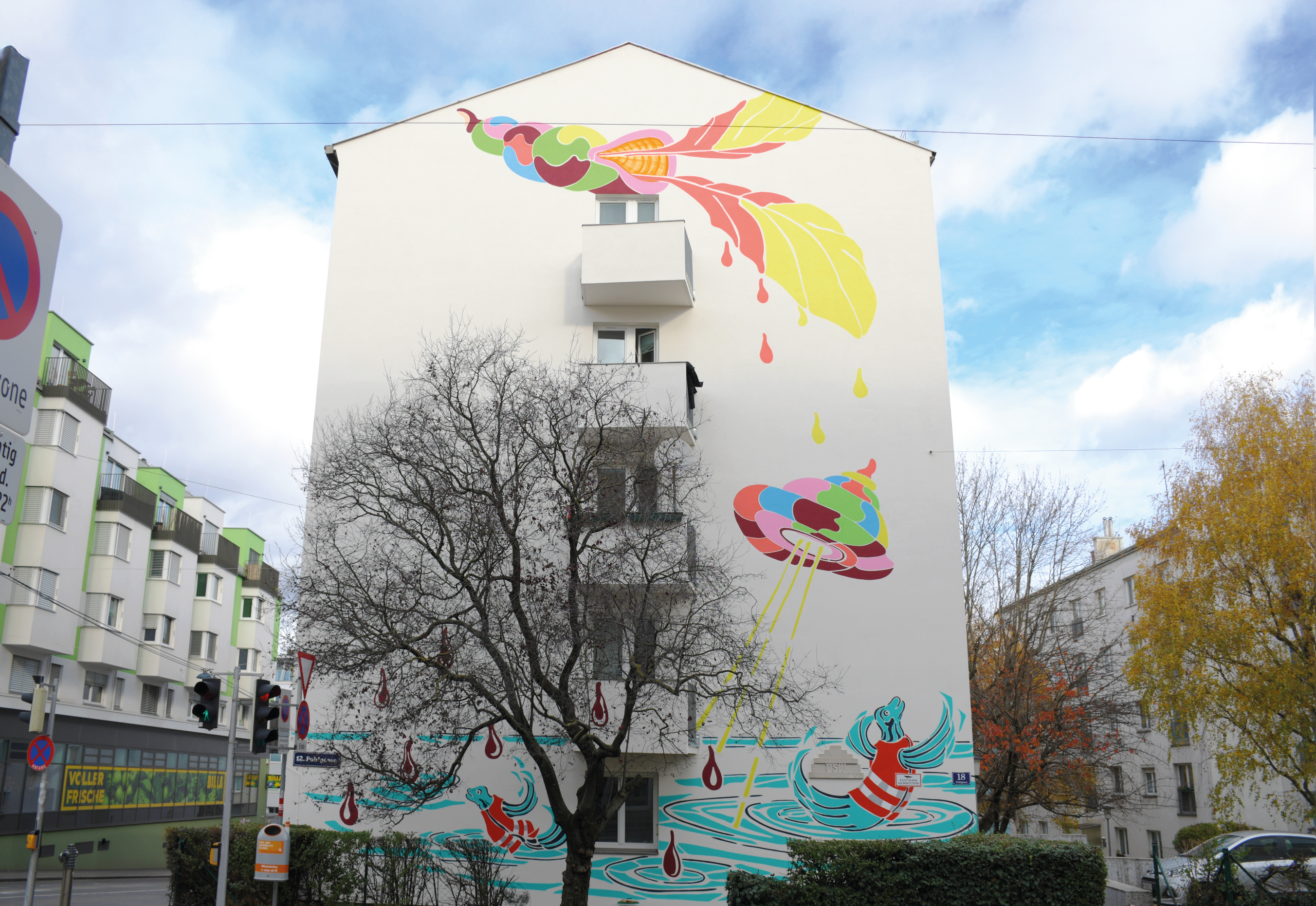In Kooperation mit KÖR Kunst im öffentlichen Raum Wien, einer Institution der Stadt Wien Kunst GmbH, wurde die Künstlerin Anna Meyer von einer Expert:innenjury für die Gestaltung der straßenseitigen Hauswände der Pohlgasse 16 und 18 ausgewählt. Das Kunstwerk „Schneckenhaus warnt Flugschnecke“, das nun die Fassaden schmückt, greift zentrale Themen unserer Zeit wie Leben, Wohnen, Schutz und Klima auf und schafft durch kräftige Farben und klare Linien eine fröhliche und gleichzeitig nachdenkliche Atmosphäre.