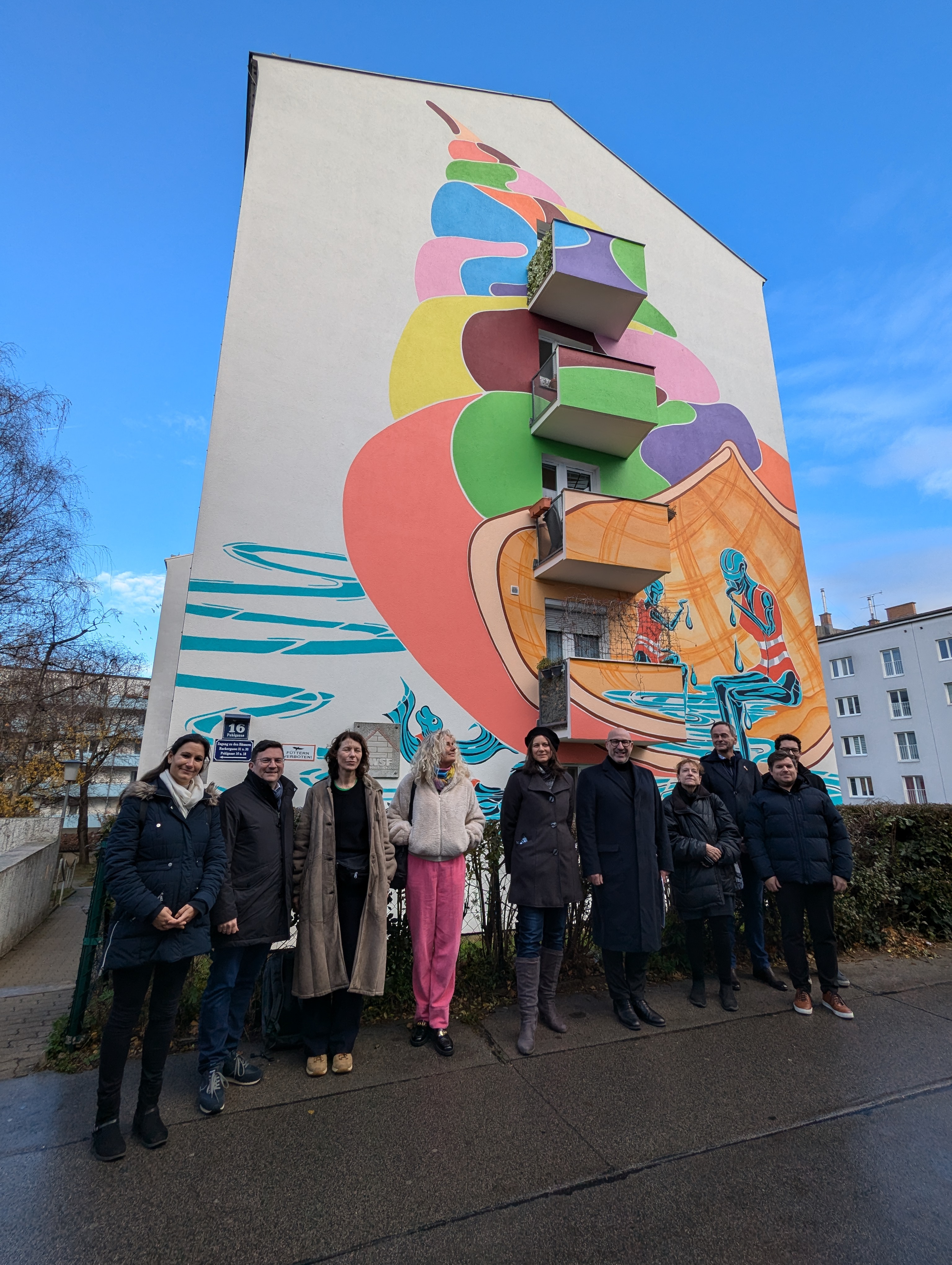 Bezirksvorsteher Wilfried Zankl zeigte sich begeistert von der Aufwertung des Wohnviertels durch das Projekt: „Mit diesem Kunstwerk gewinnt die Pohlgasse an einmaligem Wiedererkennungswert. Es ist ein tolles Beispiel dafür, wie Kunst den öffentlichen Raum aufwerten und gleichzeitig gesellschaftliche Themen aufgreifen kann.“ Die stellvertretende Bezirksvorsteherin Barbara Marx ergänzte: „Projekte wie dieses machen unseren Bezirk noch lebenswerter und setzen ein starkes Zeichen für eine moderne und weltoffene Stadt.“